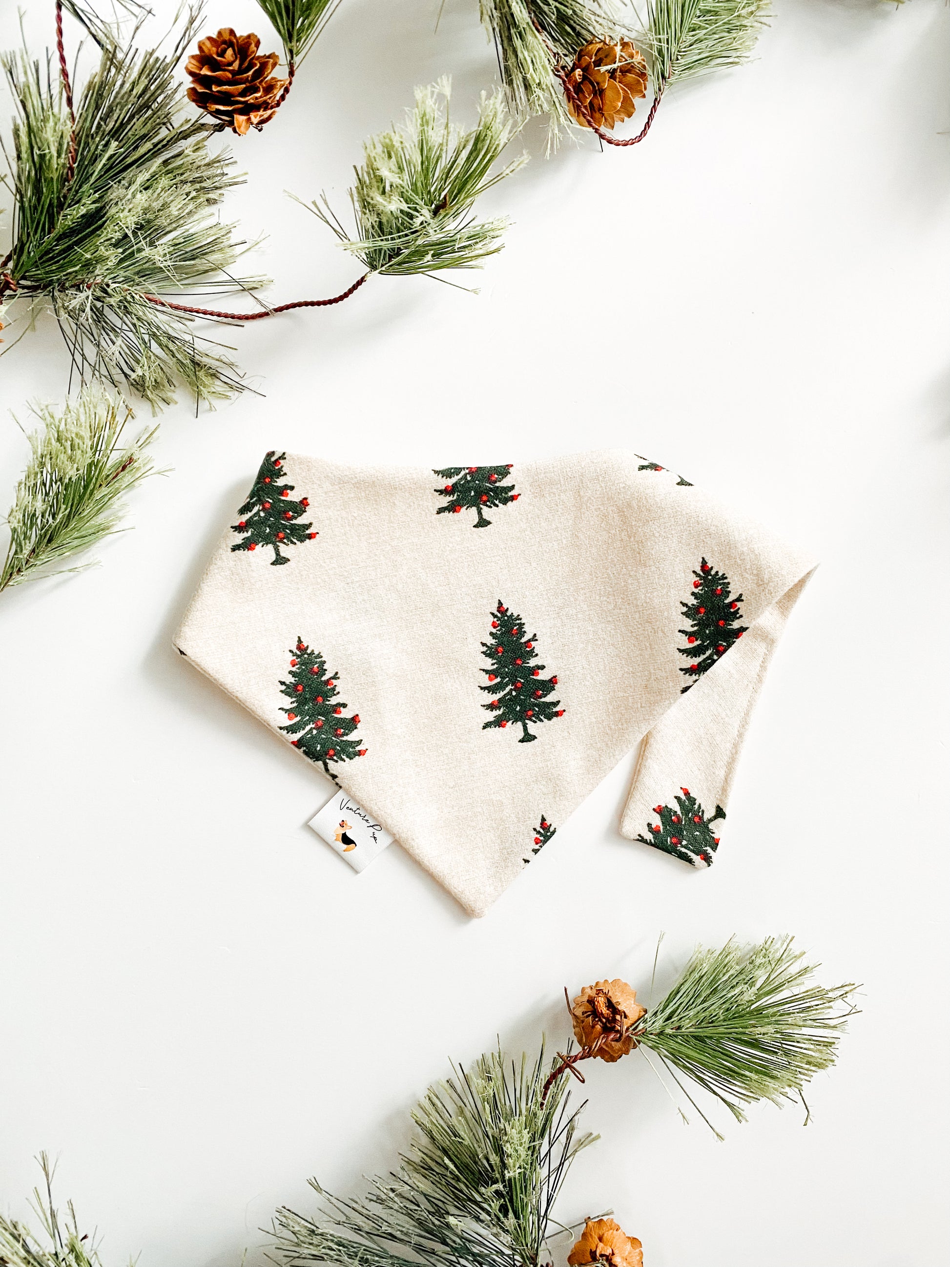 Inspired by Christmas tree farms, this soft bandana features elegant pine trees and deep red ornaments.