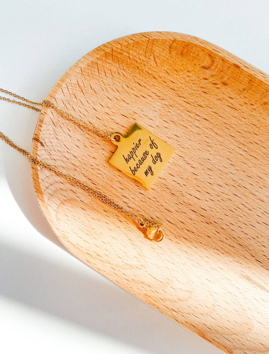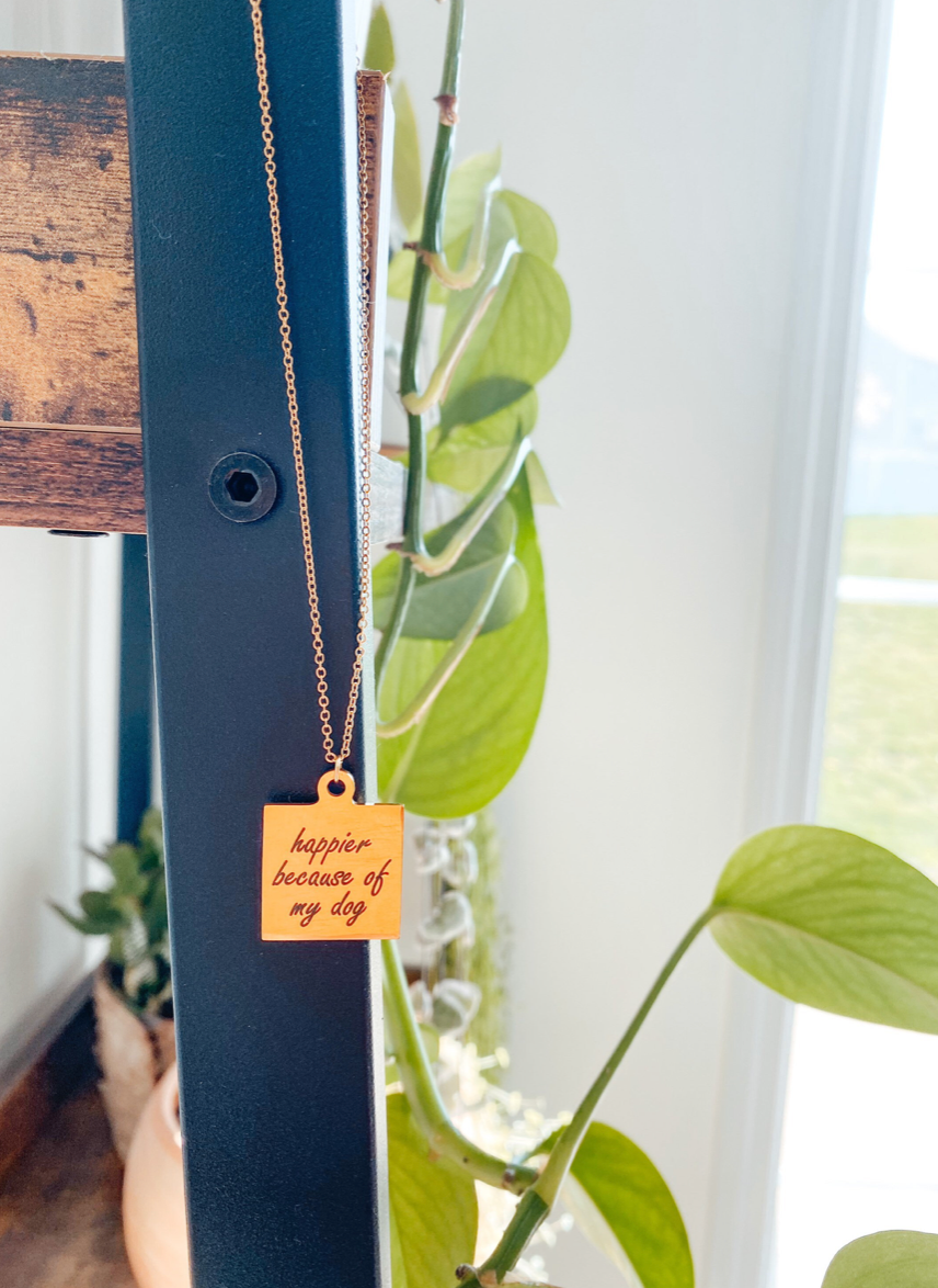 Engraved 'Happier because of my dog' necklace perfect for showing off your unique style and love for your dog. See sizing and material details below.