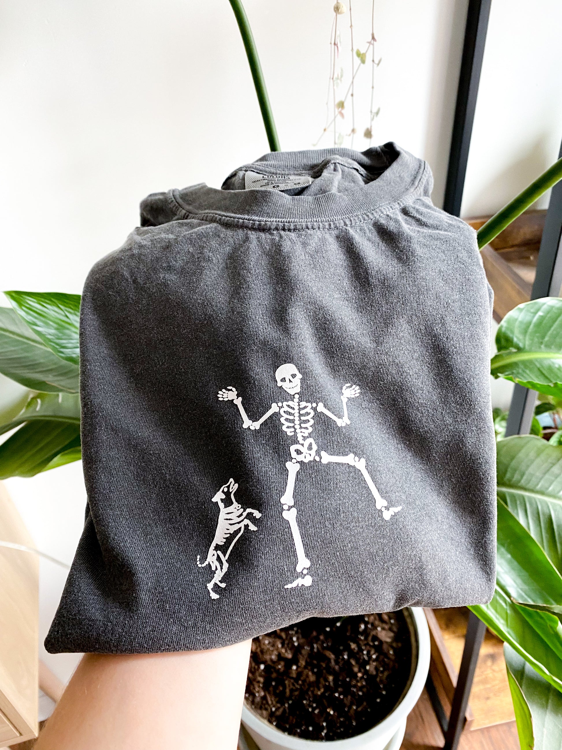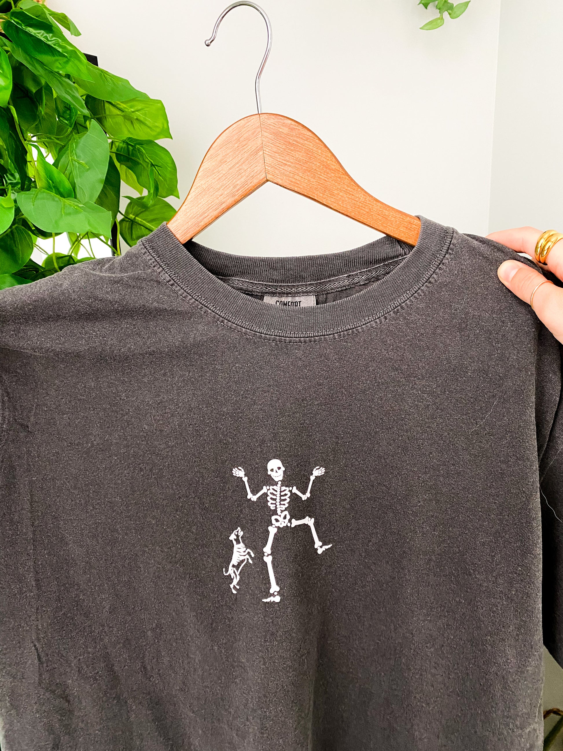 Cute skeleton themed tee of you dancing with your pup.ย See sizing and material details below.