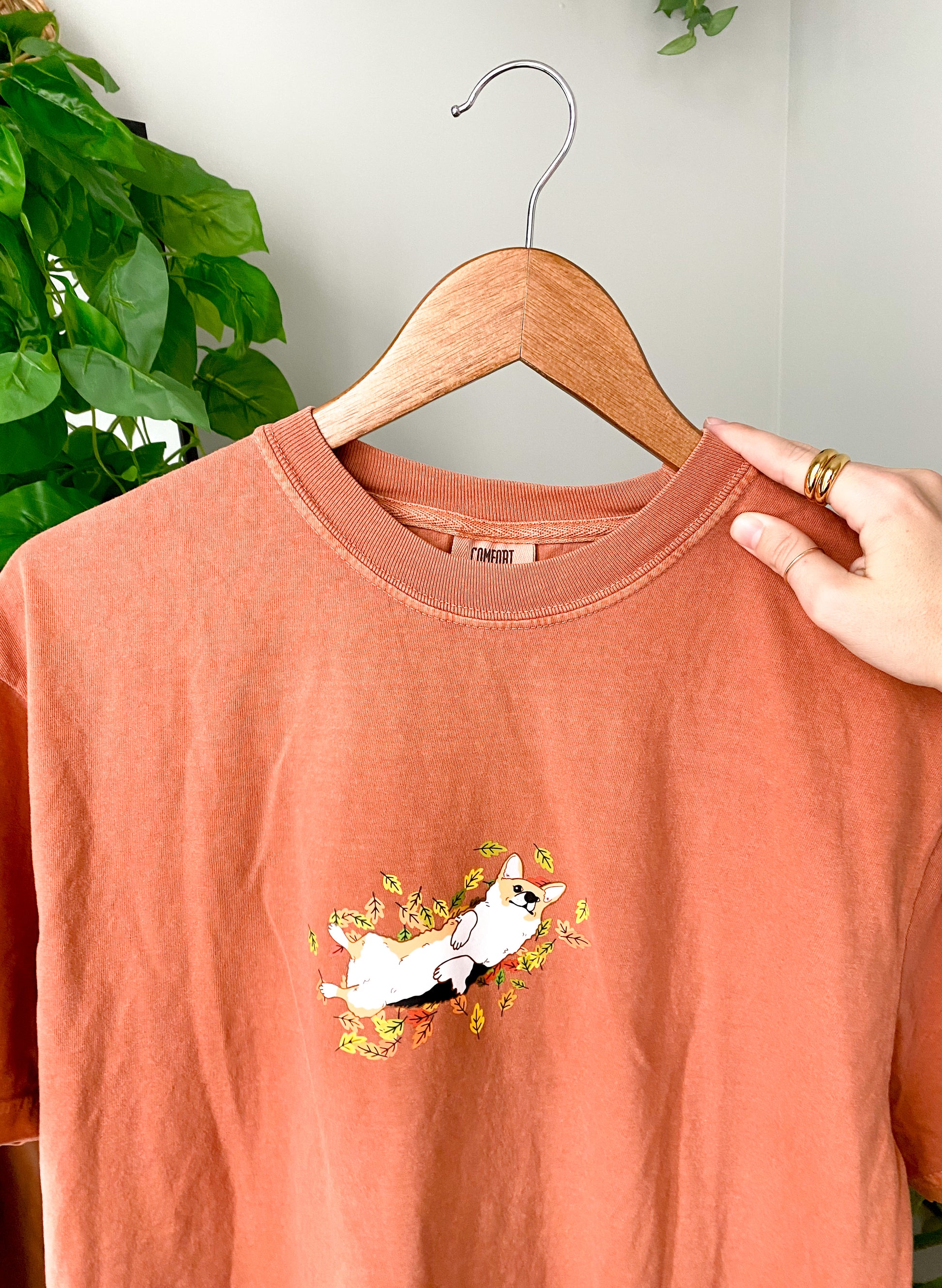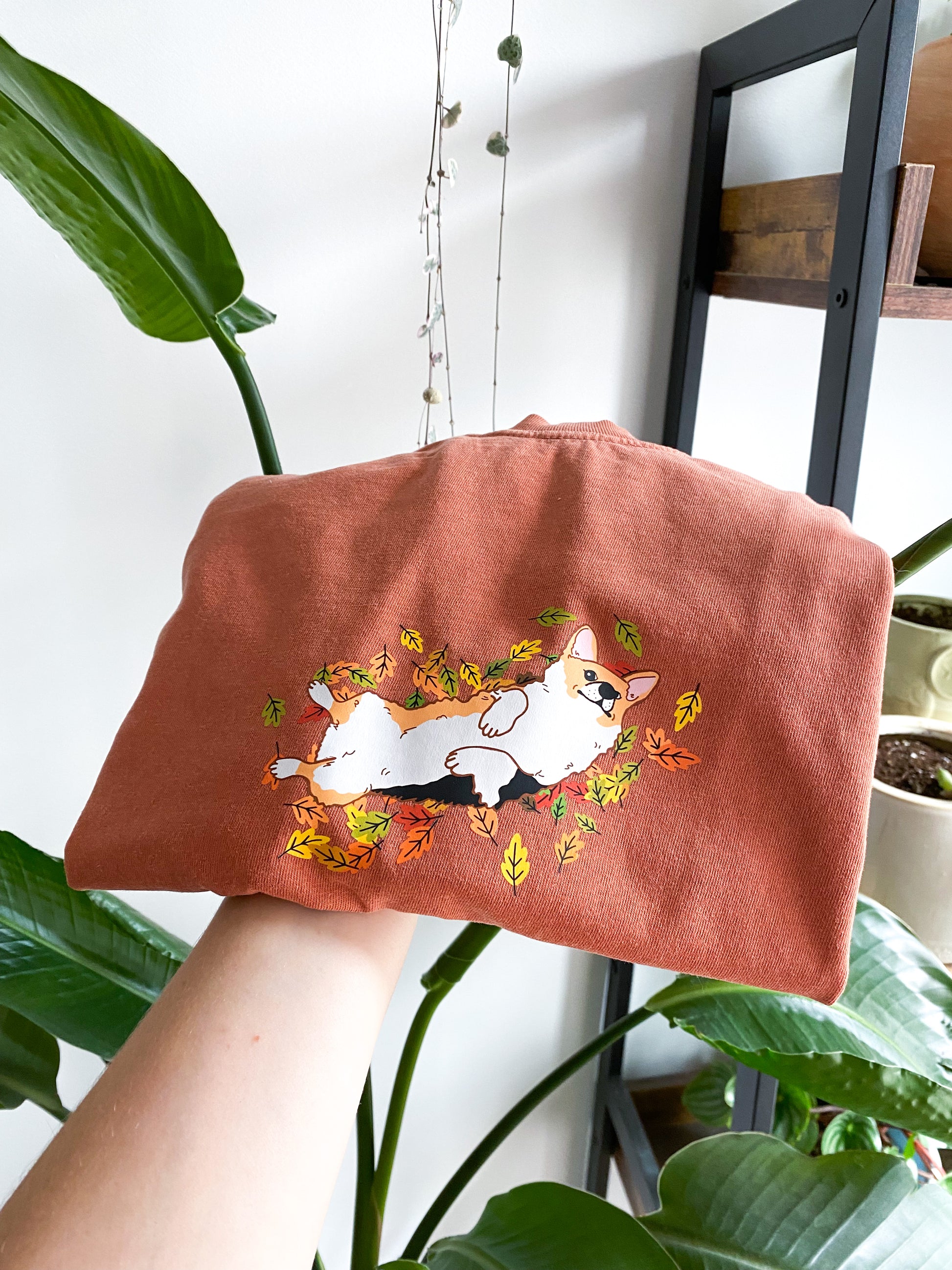 Bringing the best of both worlds together- a cute pup rolling in beautiful, colorful fall leaves